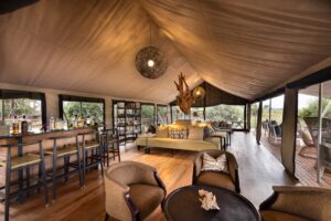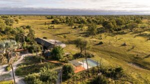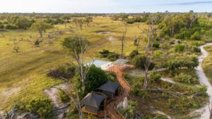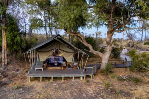 The property’s safari-style canvas tents are havens of eco-luxury with outdoor showers and all the modern comforts attached. The main area of camp is an inviting space, light and airy with lovely views over the Gomoti River and trees beyond. The lounge is scattered with comfy sofas and chairs, and there is also a swimming pool and outdoor area where a campfire is lit each evening.