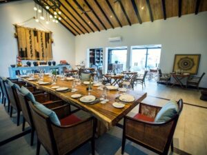 - Bar and restaurant decorated with dark wood furniture, woven baskets and tribal masks