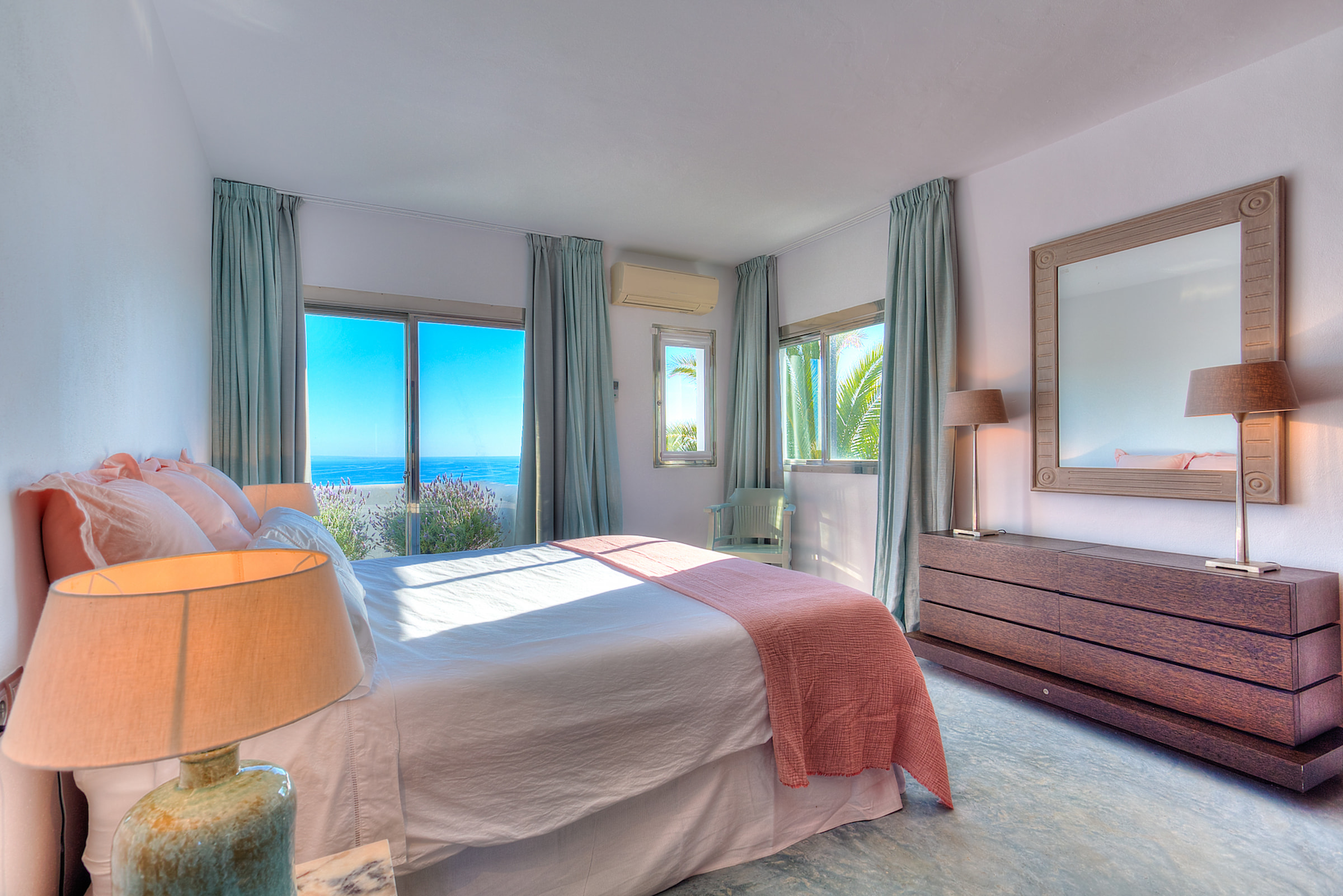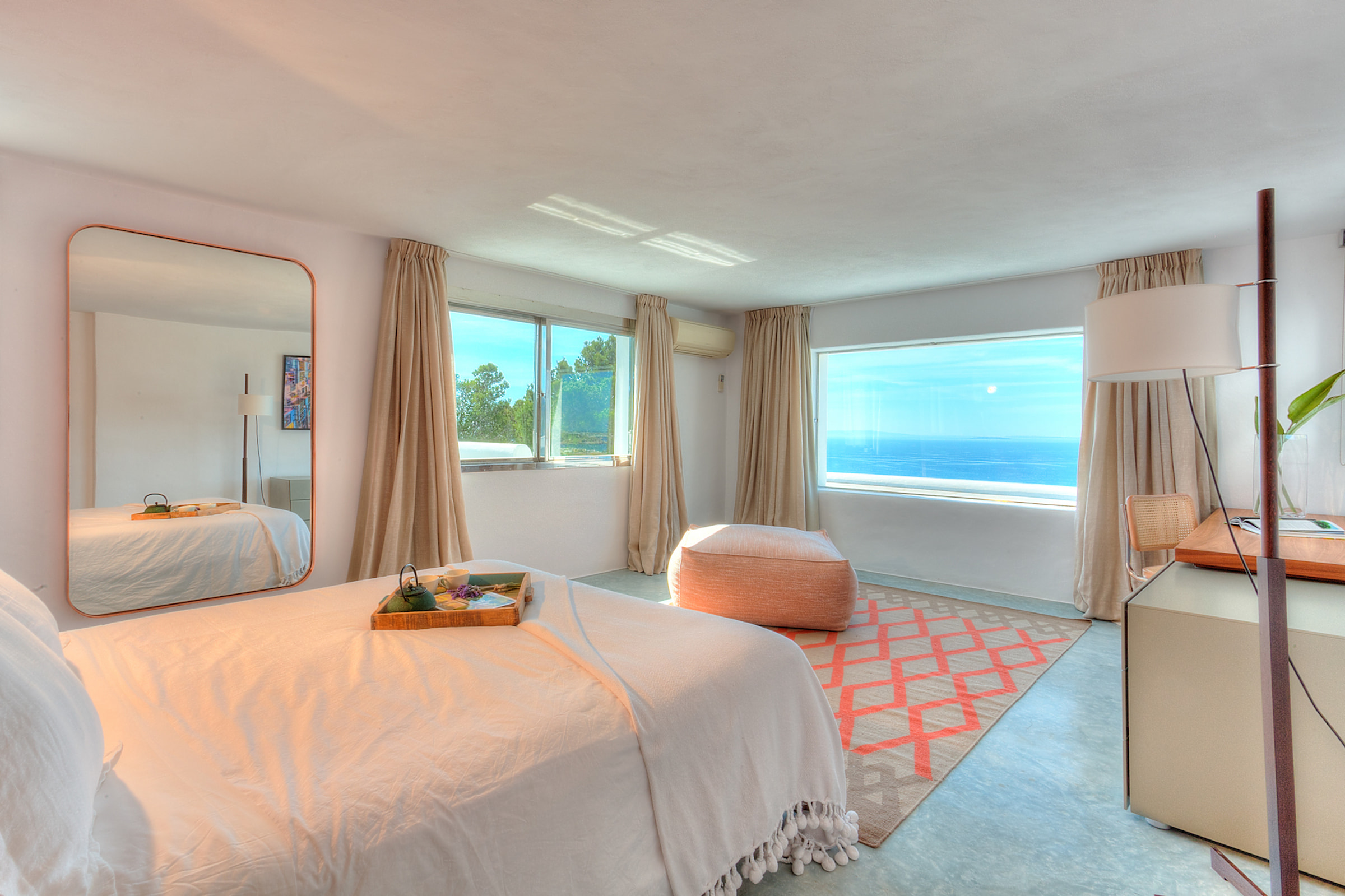 The interiors are spacious and light-filled, blending clean-lined modern design with rustic Ibizan touches. Whitewashed walls, natural textures and wide windows frame the views. Outside, a shaded lounge, private pool and barbecue area create easy spaces for entertaining or unwinding.