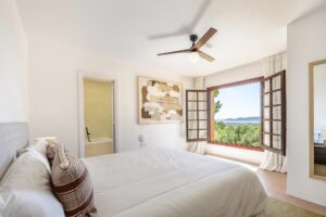 Bedroom 4 (Top Floor – Master Suite): Double bed; ensuite bathroom with bathtub; sea views; personal safe; the most private bedroom in the villa.